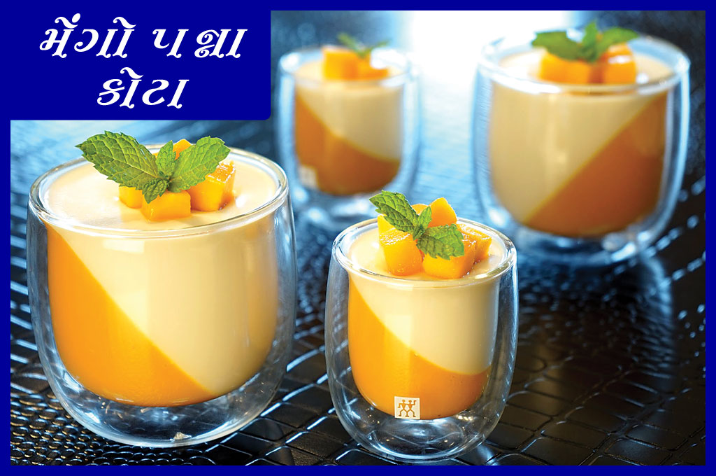 મિક્સિંગ બાઉલમાં ગરમ પાણીમાં જિલેટિન નાખીને મિક્સ કરો. તેમાં ૨ કપ મેંગો પ્યૂરી નાખીને હલાવો. એક બાઉલમાં સર્વિંગ ગ્લાસને થોડો વાંકો મૂકો અને મેંગો પ્યૂરીને કિનારી સુધી ભરીને ૨ કલાક માટે ફ્રિજમાં સેટ થવા મૂકો. દૂધમાં નાની ચમચી જિલેટિન નાખીને ધીમા ગેસ પર હળવું ગરમ કરો. ગેસ પરથી ઉતારીને તેમાં ૧ કપ ક્રીમ નાખીને મિક્સ કરો. પછી તેમાં સ્વીટનર પાઉડર, વેનિલા એસેંસ અને મીઠું નાખીને ત્યાં સુધી મિક્સ કરો જ્યાં સુધી તમામ વસ્તુ મિક્સ ન થાય. હવે તેને મેંગો પ્યૂરી ગ્લાસમાં નાખીને ફ્રિજમાં સેટ થવા માટે મૂકો. ઠંડું થતા મેંગોના ટુકડાથી સજાવીને સર્વ કરો.
