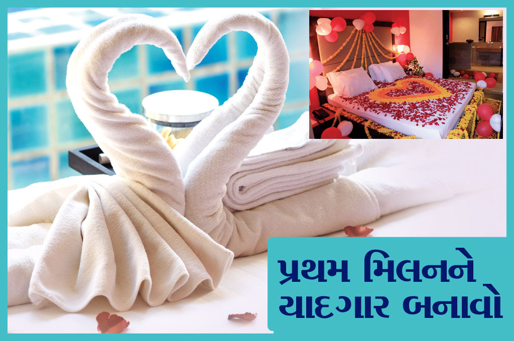 ખાસ ડેકોરેશન : તે જગ્યા જ્યાં તમારું પહેલી વાર એકબીજા સાથે શારીરિક રીતે મિલન થવાનું છે, ત્યાંનું વાતાવરણ એવું હોવું જેાઈએ કે તમે તમારા સંબંધને એન્જેાય કરી શકો. રૂમમાં ખાસ પ્રકારનો રંગ અને સુગંધનો પ્રયોગ કરો. તમે ઈચ્છો તો રૂમમાં એરોમેટિક ફ્લોરિંગ કેન્ડલથી રોમેન્ટિક વાતાવરણ બનાવી શકો છો. તે ઉપરાંત રૂમમાં બંનેને ગમતું મ્યૂઝિક અને ઓછો પ્રકાશ પણ વાતાવરણને રોમેન્ટિક બનાવવામાં મદદ કરે છે. રૂમને તમે રેડ હાર્ટશેપ બલૂન અને રેડ હાર્ટશેપકુશનથી સજાવો. ઈચ્છો તો રૂમમાં સેક્સી પેઈન્ટિંગ પણ લગાવી શકો છો. ફૂલથી પણ રૂમ સજાવી શકો છો. આ તમામ તૈયારીથી સેક્સ હોર્મોન્સના સ્રાવને વધારવામાં મદદ મળશે અને તમારું પ્રથમ મિલન હંમેશાં માટે તમને યાદ રહેશે. સેફ્લ ગ્રૂમિંગ : પ્રથમ મિલનનો દિવસ નિશ્ચિત થયા પછી તમે તમારી ગ્રૂમિંગ પર ધ્યાન આપો. શારીરિક અને માનસિક રીતે પોતાને તૈયાર કરો. તેનાથી ન માત્ર આત્મવિશ્વાસ વધે છે, પરંતુ તમે સ્ટ્રેસ ફ્રી થઈને સારું પ્રદર્શન કરશો. પ્રથમ મિલનથી પહેલા પર્સનલ હાઈજીનને મહત્ત્વ આપો, જેથી તમને સંબંધ બનાવતી વખતે ખચકાશો નહીં અને તમે પ્રથમ મિલનને એન્જેાય કરી શકો.